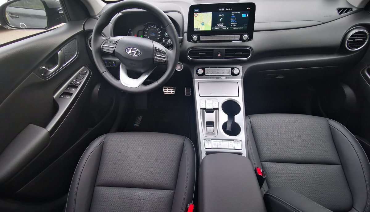 Sofort beim Einsteigen in den Hyundai fällt auf: Hier steht ein Auto, dessen Hersteller sehr konservativ über Elektromobilität denkt. Eigentlich unterscheidet sich das Cockpit des Kona überhaupt nicht von den Cockpits herkömmlicher Verbrenner. Kein Vergleich zu Tesla. Alles sieht aus wie aus einer vergangenen Zeit: zig Knöpfe, einfache Anzeigen und einfach, aber robust wirkende Oberflächen. In Verbrenner-Kategorien würde man den Kona wohl in die untere Mittelklasse einordnen – hauptsächlich weil er allerlei gut funktionierende Assistenzsysteme an Bord hat.