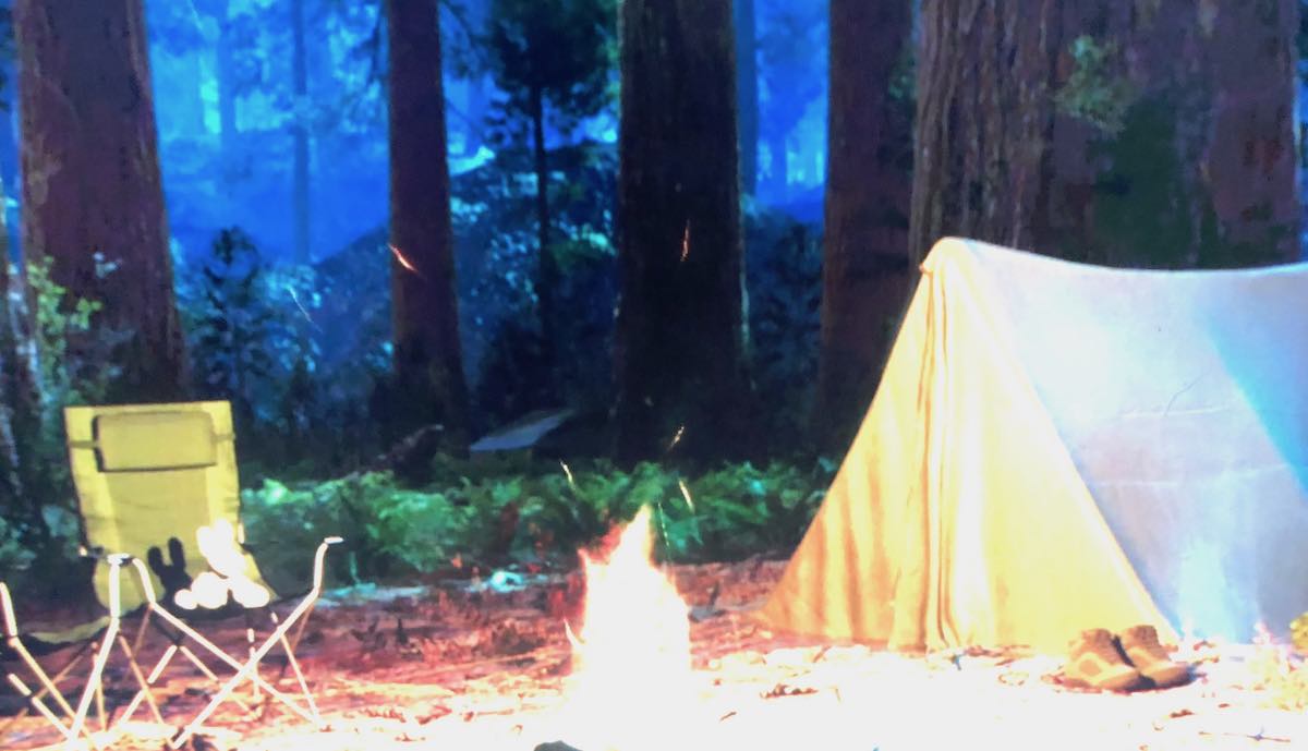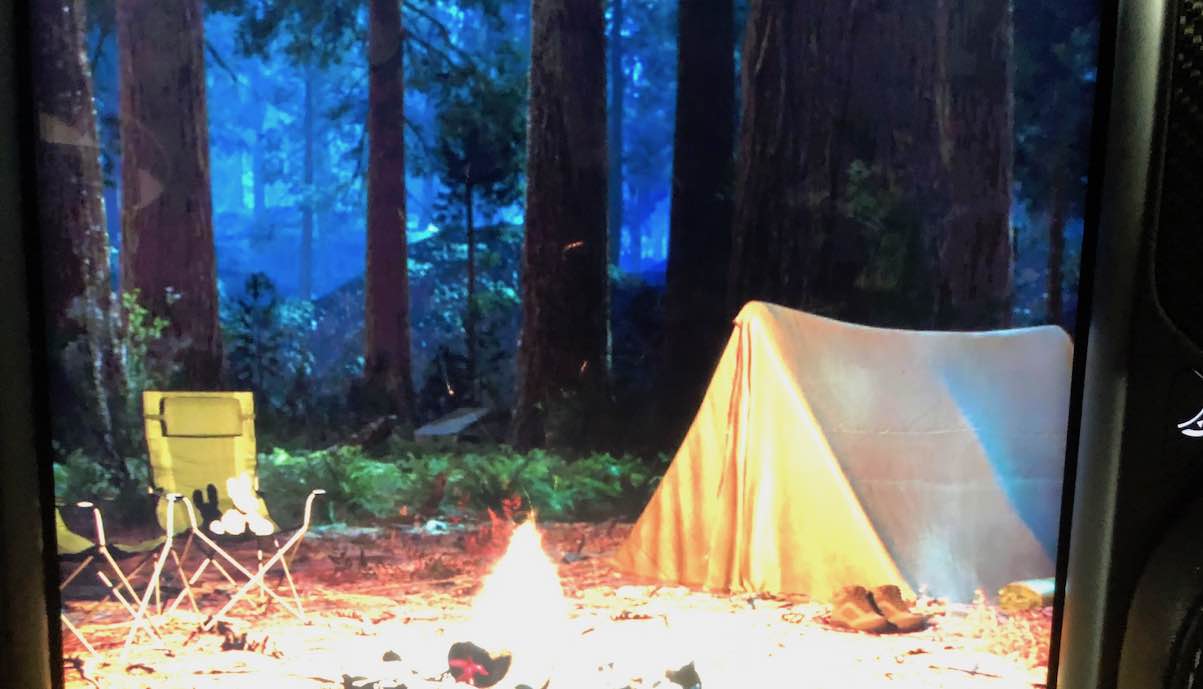 Das ansonsten unbewegte Bild zeigt nicht nur ein loderndes Feuer inmitten einer Waldlichtung, ein dreieckiges Zelt rechts und zwei Klappstühle links davon, sondern auch die Front und ein Stück linke Seite des Cybertruck. Dazu muss man allerdings sehr genau hinsehen – wobei eine Aufhellung in dem Video hilft.