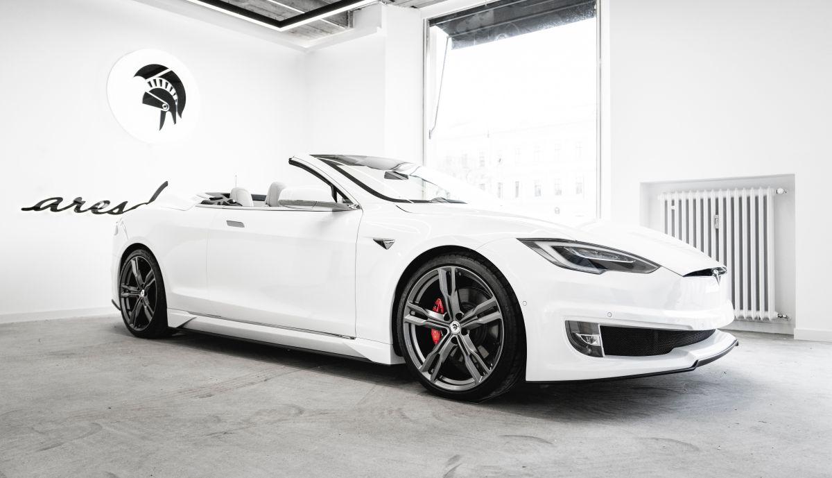 Nach Angaben von Ares wurde die Struktur des Model S ebenfalls stark modifiziert. Das ist logisch, wenn es verwindungssteif bleiben soll, denn ohne festes Dach fehlt dem Elektroauto einiges an Stabilität. Dies wurde durch Verstärkungen im Bereich der Seitenteile sowie unter dem Cockpit und dem hinteren Sitzbereich ausgeglichen. Rein optisch bekam der Tesla ein Karosserie-Kit, das ihn noch dynamischer aussehen lässt.