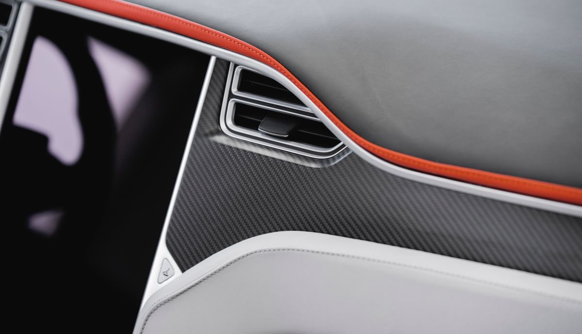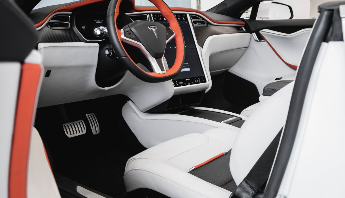 Auch den Innenraum hat Ares Design aufwendig umgestaltet. Das Armaturenbrett wurde überarbeitet und mit roten Zierlinien versehen, die Sitze bekamen eine Aufarbeitung mit weißem Leder und neuen Polstern. Die hinteren Sitze sind nach den Angaben ganz neu, vermutlich um dahinter mehr Platz zum Verstauen des Daches zu schaffen. Geöffnet sieht man nichts von ihm – es verschwindet im Kofferraum, dessen Deckel ebenfalls eine Eigenkonstruktion extra für das Tesla-Cabrio ist.