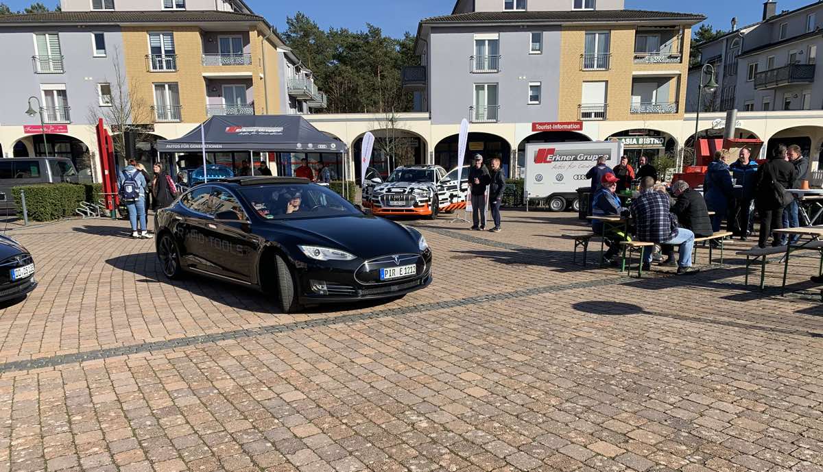 Nun standen auf dem Marktplatz rund 20 Elektrofahrzeuge, teils mit geöffneten Türen. Viele der Besitzer waren damit beschäftigt, dem Publikum ihre Autos zu präsentieren und zu erklären. Ein aus Dresden angereister Fahrer eines schwarzen Model X sagte, er nehme auch deshalb teil, weil er sich durch Giga Berlin besseren Service und eine bessere Ladeinfrastruktur in Deutschland erhoffe. Gerade im Osten gebe zu wenig Supercharger.