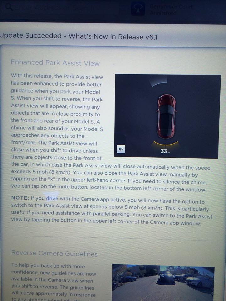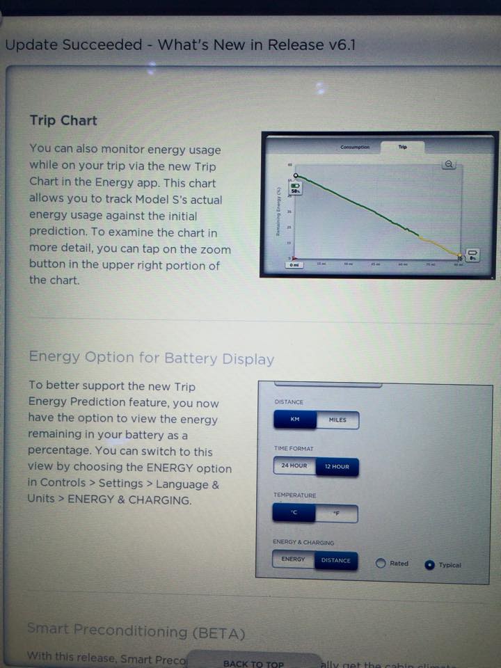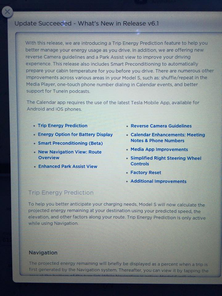Im Forum Tesla Motors Club berichten aktuell einige Model S-Besitzer über die seit Donnerstag erhältliche Firmware 6.1, welche es auch in Kürze nach Deutschland schaffen sollte. Die neueste Firmware bringt laut Änderungsprotokoll viele neue Funktionen an Bord, wie beispielsweise die Vorhersage über den wahrscheinlichen Energieverbrauch für eine vordefinierte Strecke.