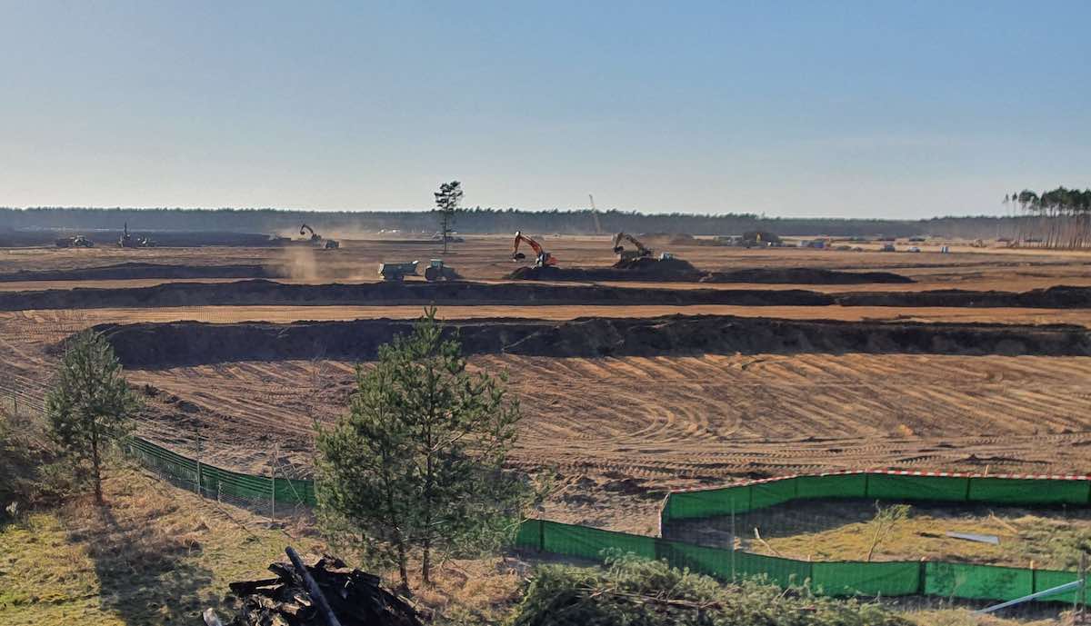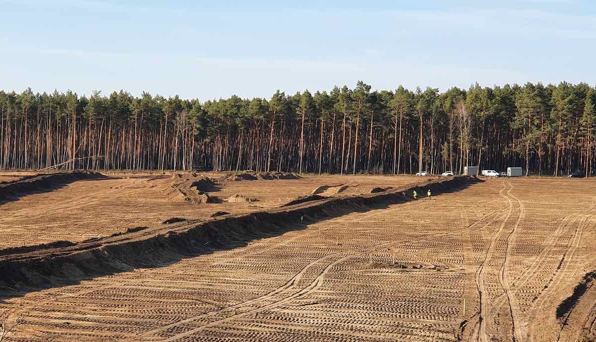 Tatsächlich wird aus dem noch vor wenigen Wochen bewaldeten Gebiet zunehmend ein erkennbares Baufeld. Bilder von @Gf4Tesla zeigen eine große und von Baumresten befreite, sauber planierte braune Fläche; einige kleine Bereiche sind mit niedrigen grünen Bahnen umzäunt, wohl zum Schutz von Waldameisen. Einige Bäume, die zunächst stehen bleiben mussten, weil darin Fledermäuse vermutet wurden, sind mittlerweile ebenfalls gefällt.