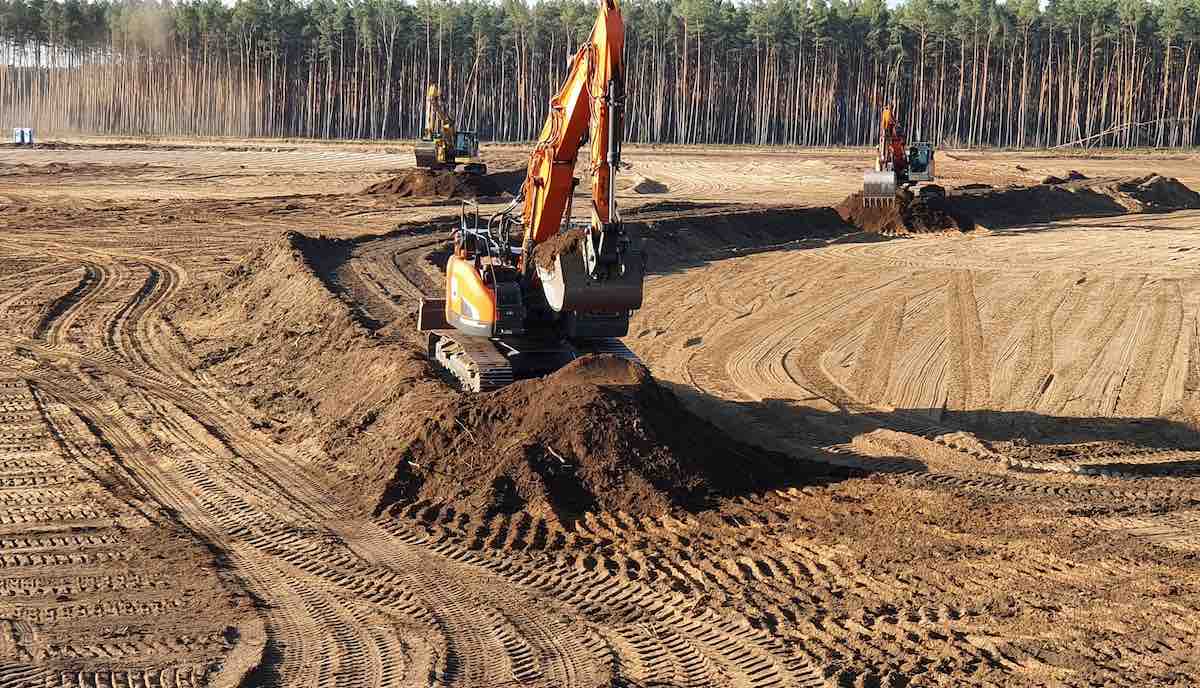 Aber auch beim Planieren scheint Tesla keine Zeit zu verlieren. Seit der zweiten Genehmigung melden Beobachter täglich intensive Arbeiten mit vielen schweren Maschinen auf dem Gigafactory-Gelände, teils auch am Wochenende. Nach einer Zählung von @GF4Tesla auf Twitter waren dort allein an diesem Donnerstag 12 Bagger, 6 Bulldozer, 15 Traktoren, 10 Häcksler und viele Walzen zu sehen. Nach seinem Eindruck werden die Arbeiten „unter Hochdruck“ betrieben.