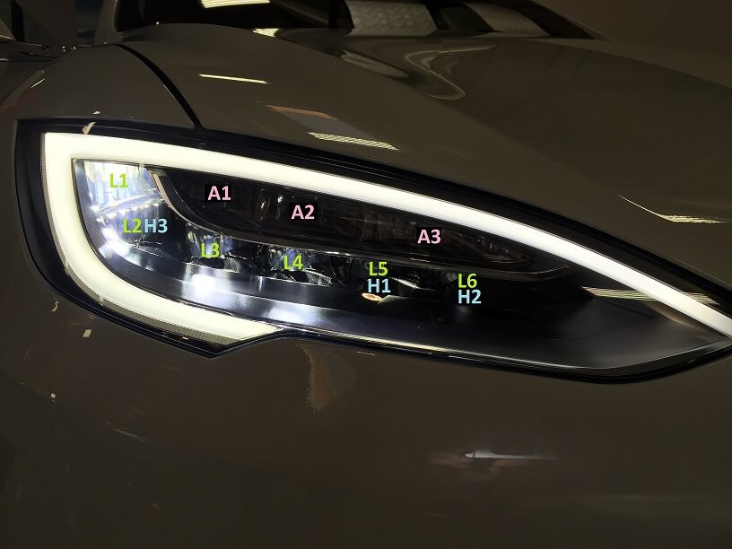 Wenn das eigene Fahrzeug über das dreistufige, dynamische LED-Abbiegelicht verfügt, dann sehen die Scheinwerfer wie auf dem ersten Bild aus, wobei A1-A3 die entsprechenden LED-Leuchten sind. Auf dem zweiten Bild sieht man wiederum Scheinwerfer ohne entsprechende Vorrichtung, die offenbar weiterhin verbaut werden, obwohl die Standardausstattung etwas anderes erklärt.