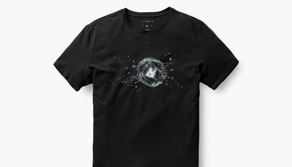 „Macht kugelsicher und muskulös“, schrieb CEO Musk am Dienstag zu einem Foto auf Twitter, auf dem ein neues Produkt aus dem Tesla-Webshop zu sehen ist: ein schwarzes T-Shirt mit einer großen Abbildung einer beschädigten Scheibe, wie sie nach dem Stahlkugel-Bewurf am vorderen Fenster des Cybertruck zu sehen war. Beschrieben wird das T-Shirt in Teslas Shop als „Cybertruck Bulletproof Tee, inspiriert vom Cybertruck-Präsentationsevent“.