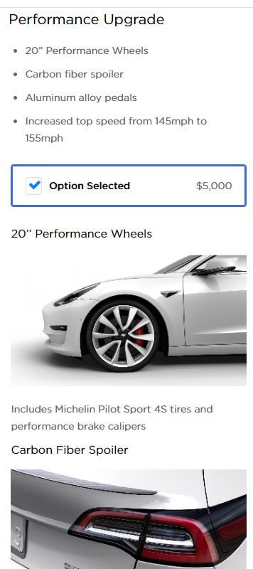 Das Performance-Modell gibt es ab sofort zum Startpreis von 64.000 US-Dollar, dafür jedoch ohne weitere Extras außer dem Doppelmotor mit Allradantrieb und die schnellere Beschleunigung. Optional kann man ein Performance-Upgrade für 5.000 US-Dollar hinzukaufen, welches 20-Zoll Performance-Felgen, Carbon-Heckspoiler, Alu-Pedale, Michelin Pilot Sport 4S Reifen und Performance-Bremssättel beinhaltet und zudem die Höchstgeschwindigkeit von 145 mph auf 155 mph erhöht (etwa 230 auf 250 km/h). Das weiße Interieur ist weiterhin lediglich beim Performance-Modell erhältlich und kostet 1.500 US-Dollar Aufpreis.