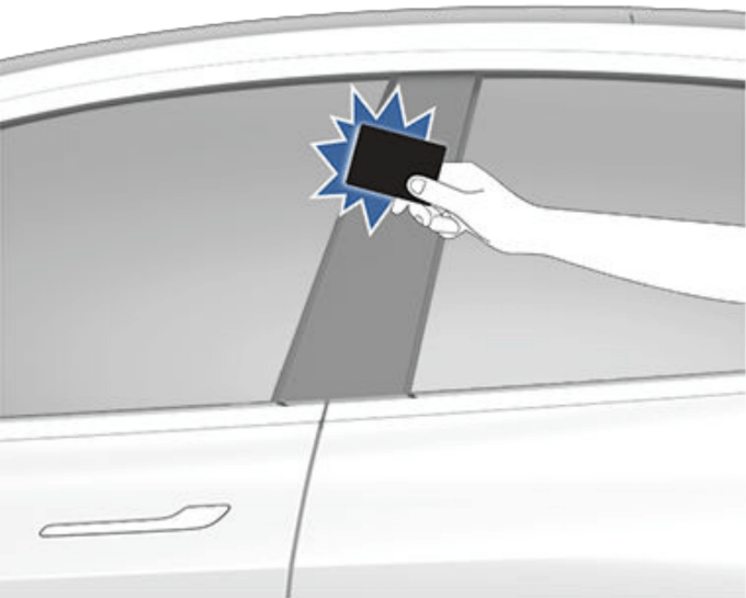 Will man hingegen gänzlich auf den Zugriff durch das Smartphone verzichten, kann man das Fahrzeug entriegeln, indem man die Schlüsselkarte bis maximal fünf Zentimeter unter der Kamera an der B-Säule hält. Sobald das Fahrzeug entriegelt ist, hat man 15 Sekunden Zeit, um durch das Betätigen des Bremspedals das Fahrzeug zu starten. Hat man diesen Zeitpunkt versäumt, kann man die Schlüsselkarte anschließend in der Mittelkonsole hinter den Getränkehaltern platzieren, wo sich ein weiterer RFID-Empfänger befindet, der dann erneut 15 Sekunden zum Fahrzeugstart gewährt.