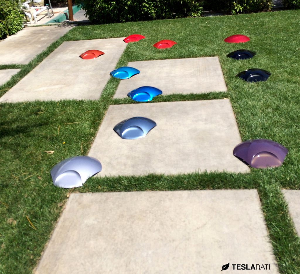Das Unternehmen hat Musterbeispielse auf dem Bodem vor dem Gebäude aufgestellt, darunter auch Farben, die bisher für das Model S oder für das künftige Model X nicht verfügbar waren. Die neuen Farben ähneln der Farbpalette des Tesla Roadsters, welcher in weitaus mehr Farbvariationen verfügbar war.