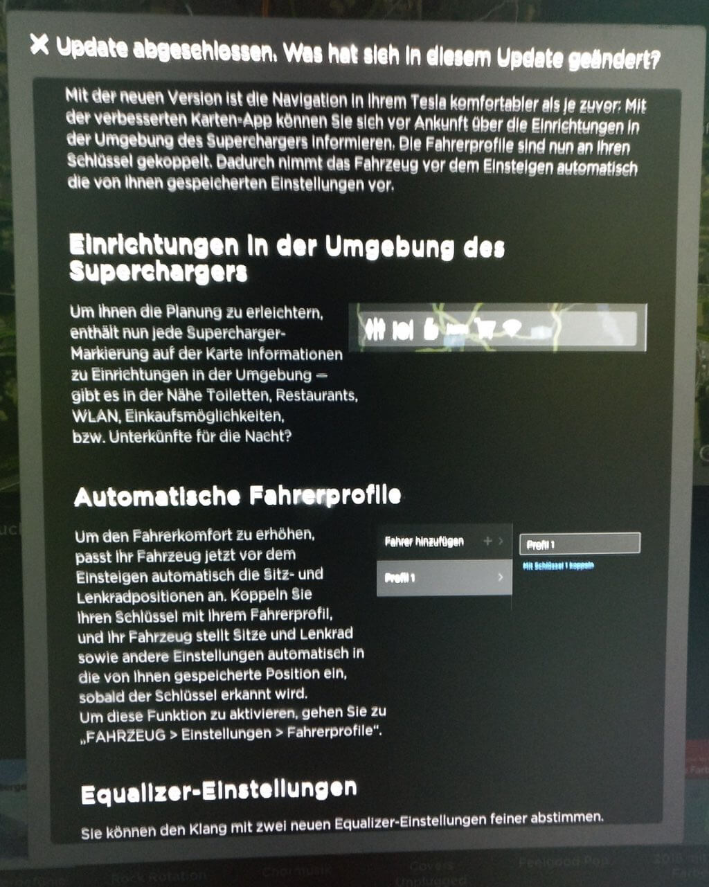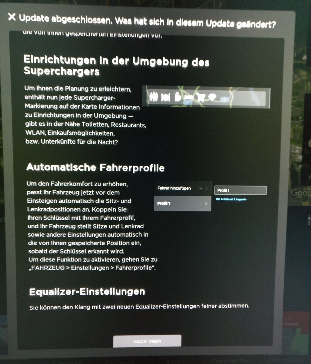 Zudem bringt das neue Update auch weitere, geringfügige Änderungen mit sich. So gibt es u.a. ein paar neue Einstellmöglichkeiten in der Klangregelung des Audio-Systems. Zudem sind Model X-spezifische Neuerungen hinzugekommen, so kann z.B. Summon (Herbeirufen) auch mit dem Schlüssel statt nur mit der App aktiviert werden. Zudem kann man einige Einstellungen am Schlüssel vornehmen, welche die Schließung der vorderen und der Falcon Wing-Türen betreffen.