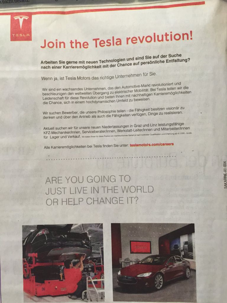 Tesla Motors hat nämlich in der heutigen Ausgabe der österreichischen Tageszeitung Kurier ein Inserat veröffentlicht, worin das Unternehmen für sich selbst als Arbeitgeber wirbt. Insbesondere sei man zudem auf der Suche nach Mitarbeitern für die neuen Niederlassungen in Graz und Linz. Somit kann es also gar nicht mehr so lange dauern, bis diese denn endlich eröffnen.