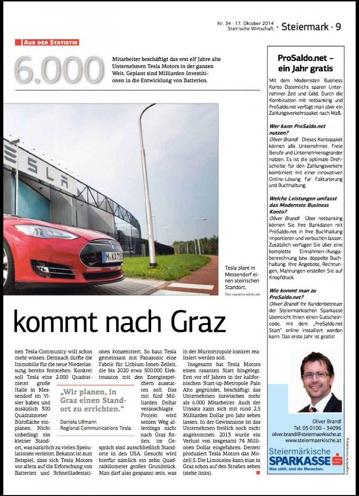 „Wir planen in Graz einen Standort zu errichten. Weitere Auskünfte dazu können wir im Moment leider nicht geben“, erklärt Daniela Ullmann, Regional Communications Tesla, auf Anfrage der Steierische Wirtschaft. Laut Gerüchten soll die 2.000 Quadratmeter große Halle in Messendorf liegen, zu der man noch zusätzlich 300 Quadratmeter Bürofläche einplant.