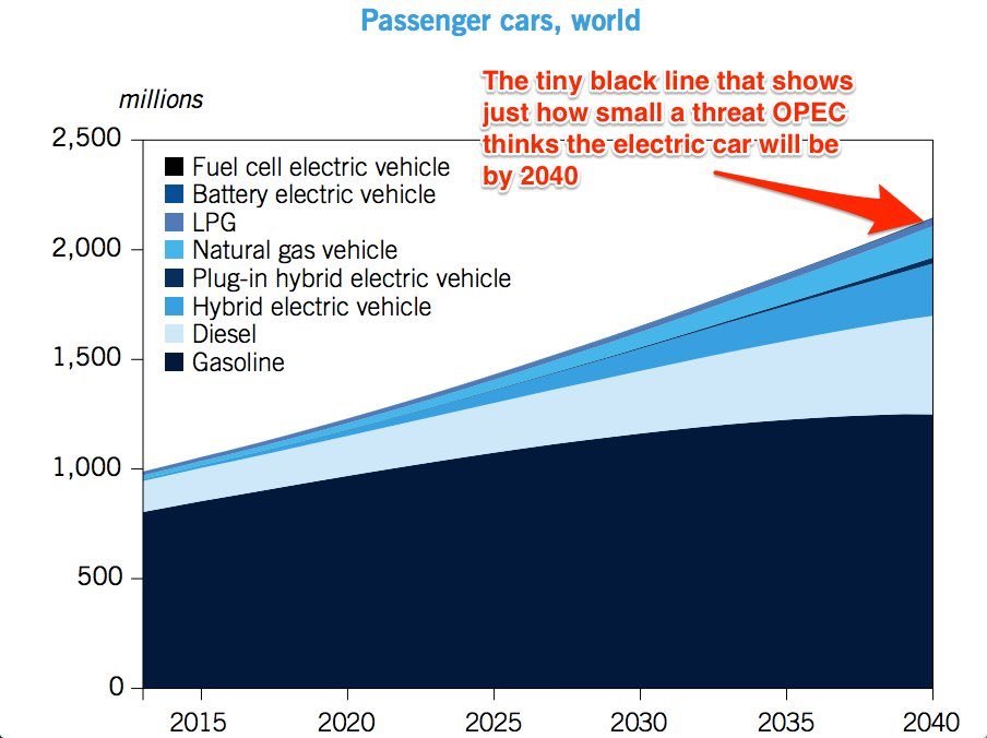 Die Organisation erdölexportierender Länder, kurz OPEC, glaubt nicht daran, dass Elektrofahrzeuge einen großen Einfluss im Bereich der Mobilität haben werden. In ihrem letzten Bericht und damit verbundenen Voraussagen bis 2040 kann man erkennen, dass zwar der Anteil an kraftstoffbetriebenen Fahrzeugen sinken wird, dieser aber weiterhin 91 Prozent ausmachen sollen.