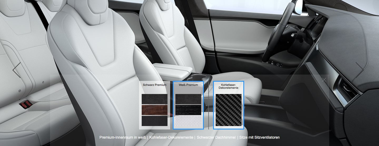 Für beide Topmodelle (Model S P100D und Model X P100D) sind jedoch die Sitze mit Sitzventilatoren eingeführt worden. Diese gehören zur Standardausstattung, egal für welchen Innenraum man sich entscheidet. Aktuell sind folgende Innenraum-Konfigurationen erhältlich: