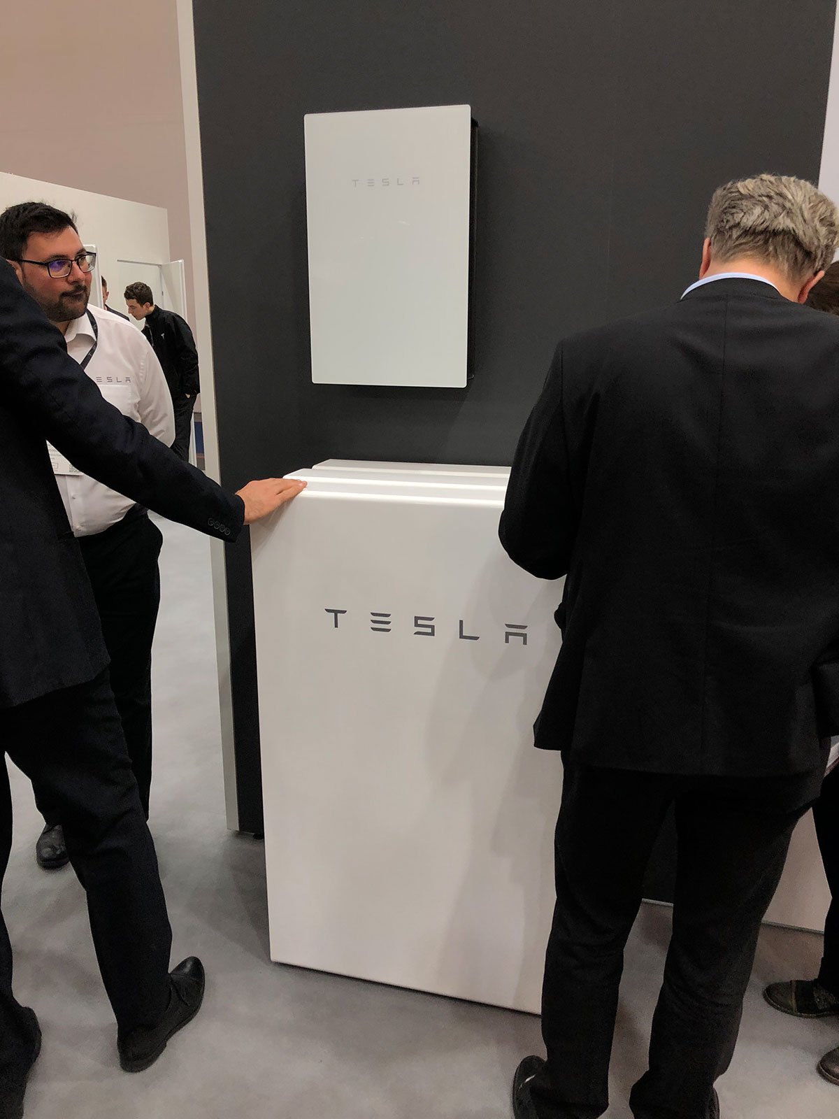 Am Stand wollte man dazu gegenüber der Presse keine Auskunft geben. Neben den ausgestellten Produkten plus Model 3 gab es dort mehrere mit Glas abgetrennte Kabinen, in denen Tesla-Mitarbeiter Verkaufsgespräche mit Geschäftskunden zu führen schienen.