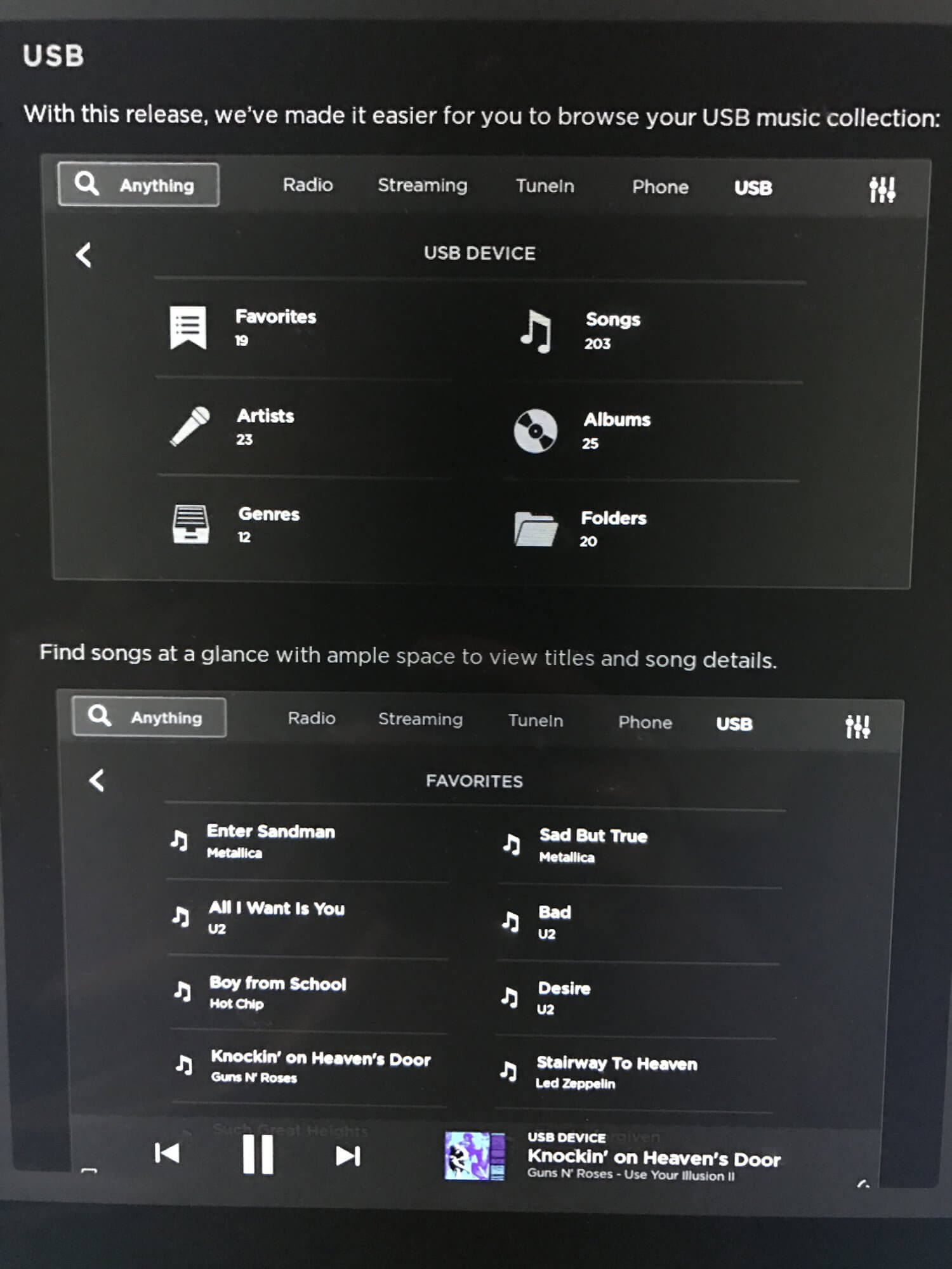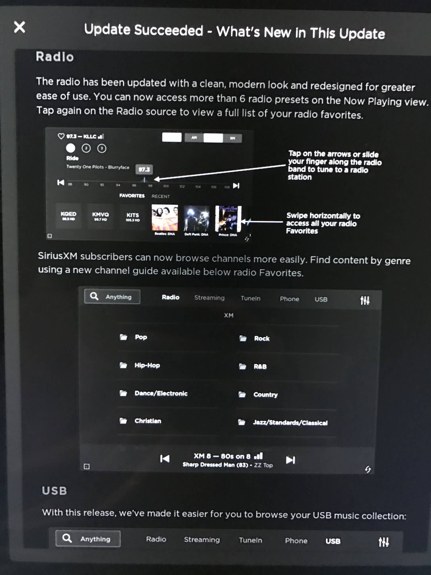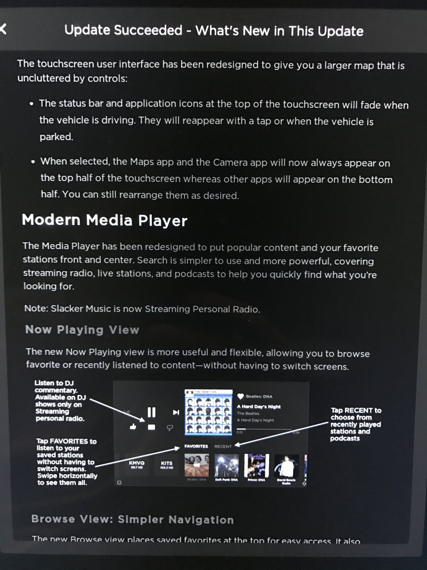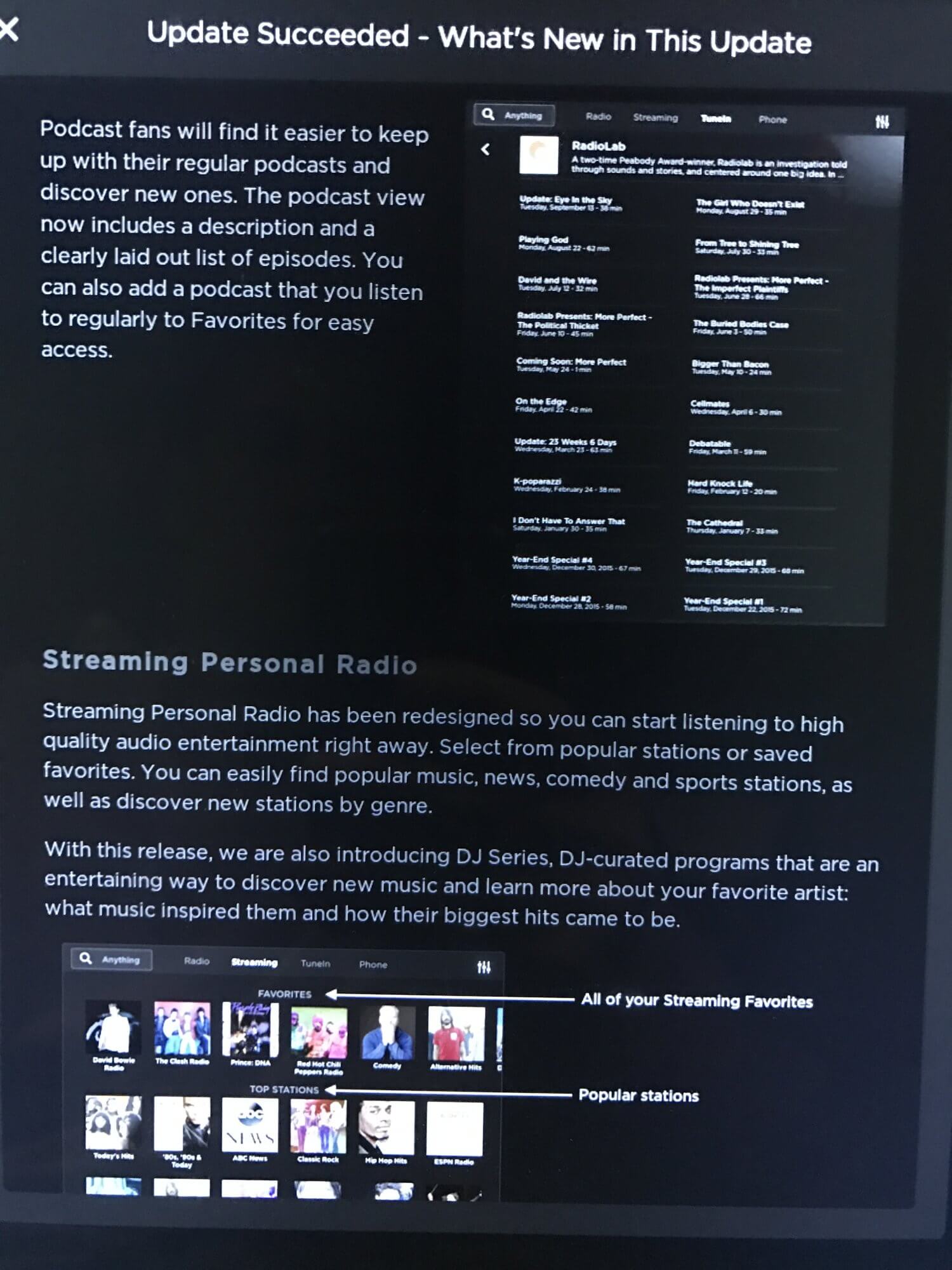 Zu den wichtigsten Neuerungen zählt Tesla den überarbeiteten Media Player, der nun deutlich intuitiver sein soll. Dieser wurde neu gestaltet und so überarbeitet, dass er den jeweils favorisierten Inhalt des Fahrers in den Vordergrund rückt. Die Suche ist einfacher und besser, man findet gesuchte Radio-Streams, gewöhnliche Radiosender und auch Podcasts in kürzester Zeit.