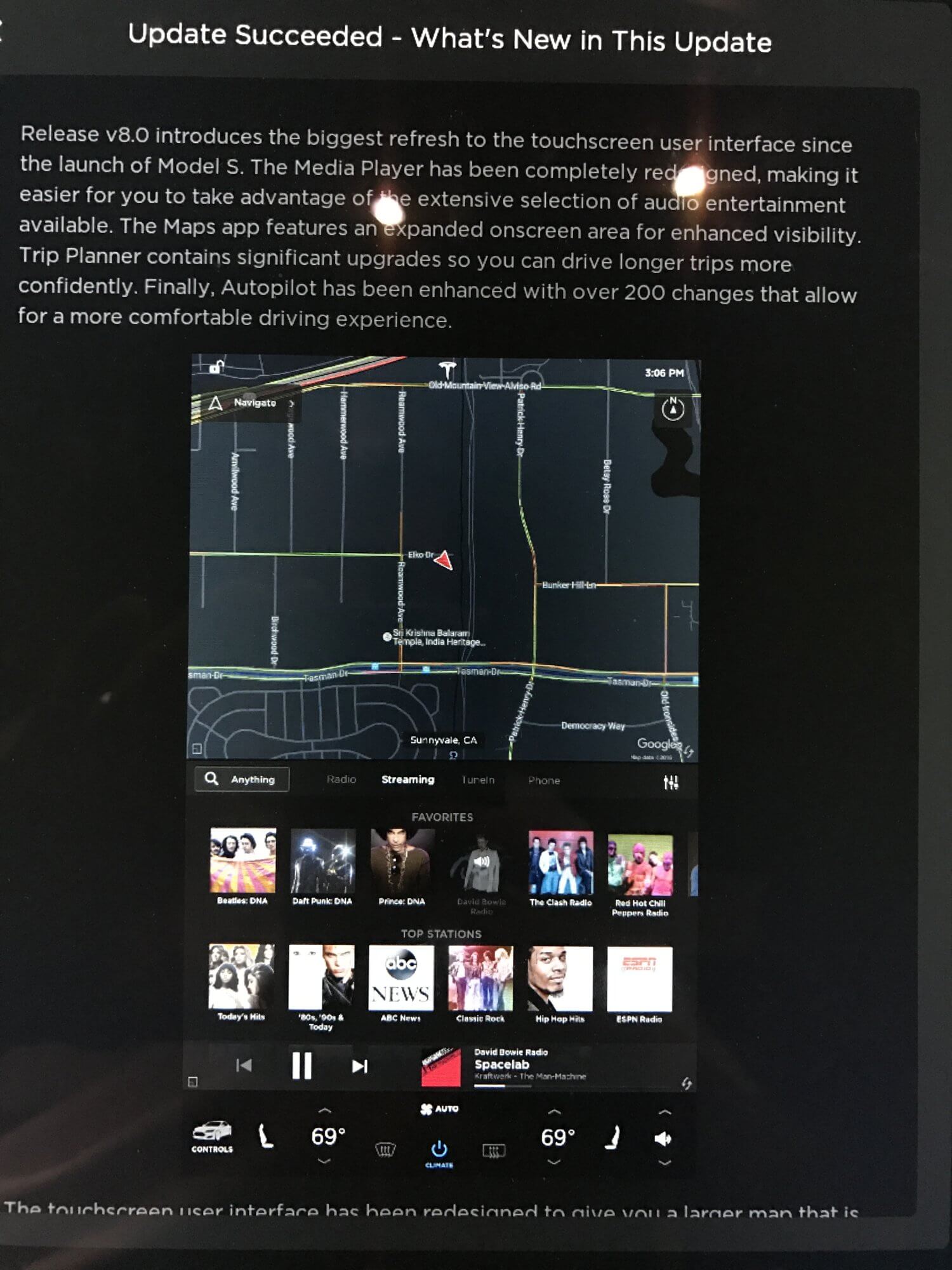 Tesla ist gerade dabei alle Kunden mit der Firmware-Version 8.0 zu versorgen, die eine signifikante Veränderung zur 7er-Version darstellt. Unter anderem wurde der Media Player überarbeitet, die Navigation verbessert und auch der Autopilot hat neue Funktionen, aber auch Restriktionen erhalten. Näheres zum Autopiloten in der Firmware-Version 8.0 gibt es hier.