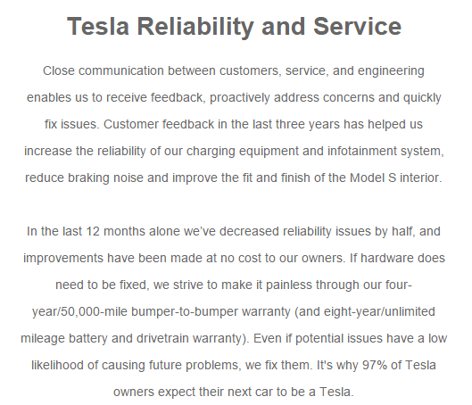 Tesla Motors gab heute über E-Mail an die eigenen Kunden bekannt, dass die anfänglichen Probleme mit der Zuverlässigkeit des Model S allein in den letzten 12 Monaten um 50 Prozent abgenommen haben. Durch Feedback von Kunden und den eigenen Mitarbeitern ist es dem Autobauer gelungen die Probleme an Kundenfahrzeugen innerhalb kürzester Zeit zu beseitigen.