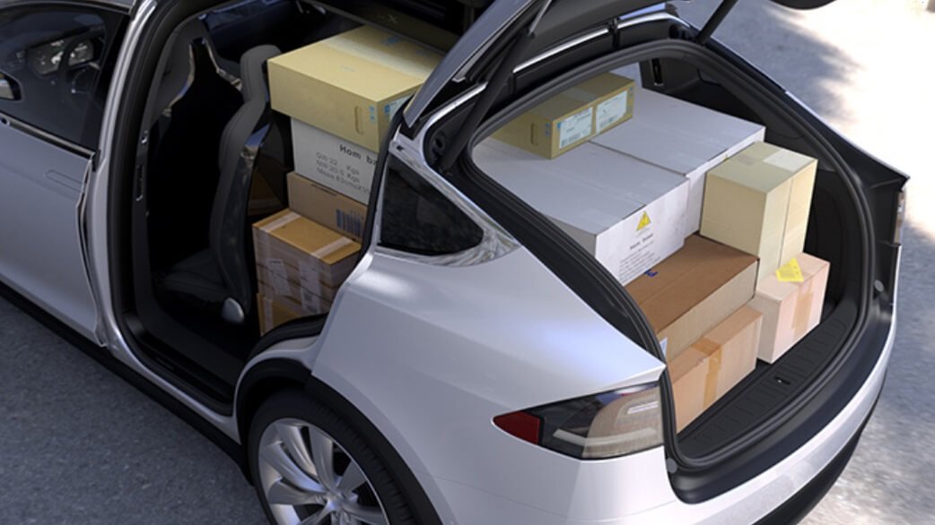 Auf den Bilder ist zudem erkennbar, dass sich die zweite Sitzreihe zwar nicht umkippen, aber nahezu vollständig nach vorne verschieben lässt. Dadurch wird das Kofferraumvolumen deutlich erhöht und auch große Pakete finden ihren Platz. Wenn man das Model X jedoch so belädt wie auf den Bildern zu sehen, dann können nur noch zwei Personen auf der vordersten Sitzreihe Platz nehmen.