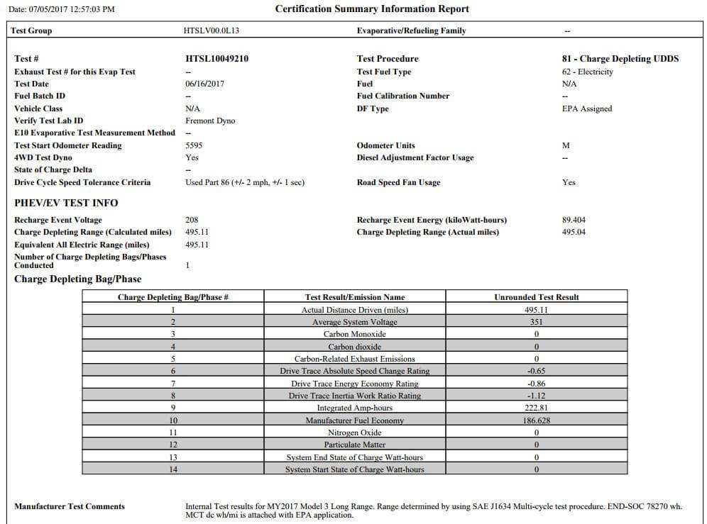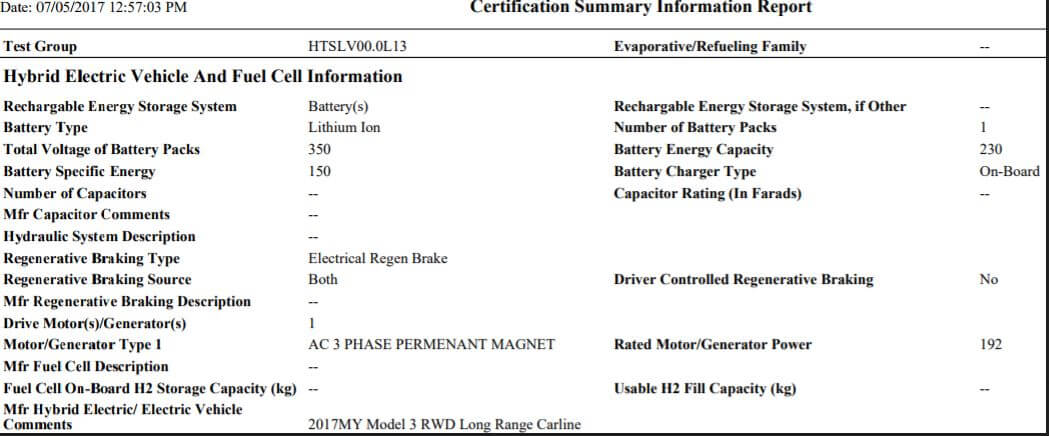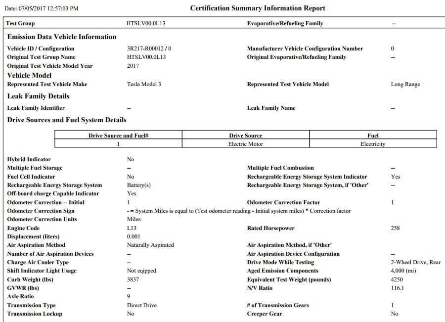 Aus den Dokumenten wird außerdem ersichtlich, dass man das Model 3 mit einer Horsepower (hp) von 258 bewertet hat. Umgerechnet wären das 192 kW Spitzenleistung. Wichtig sei hierbei anzumerken, dass es sich dabei weder um ein Fahrzeug mit Doppelmotor und Allradantrieb, noch um ein Performance-Modell handelt – letzteres dürfte deutlich höhere Werte erreichen.