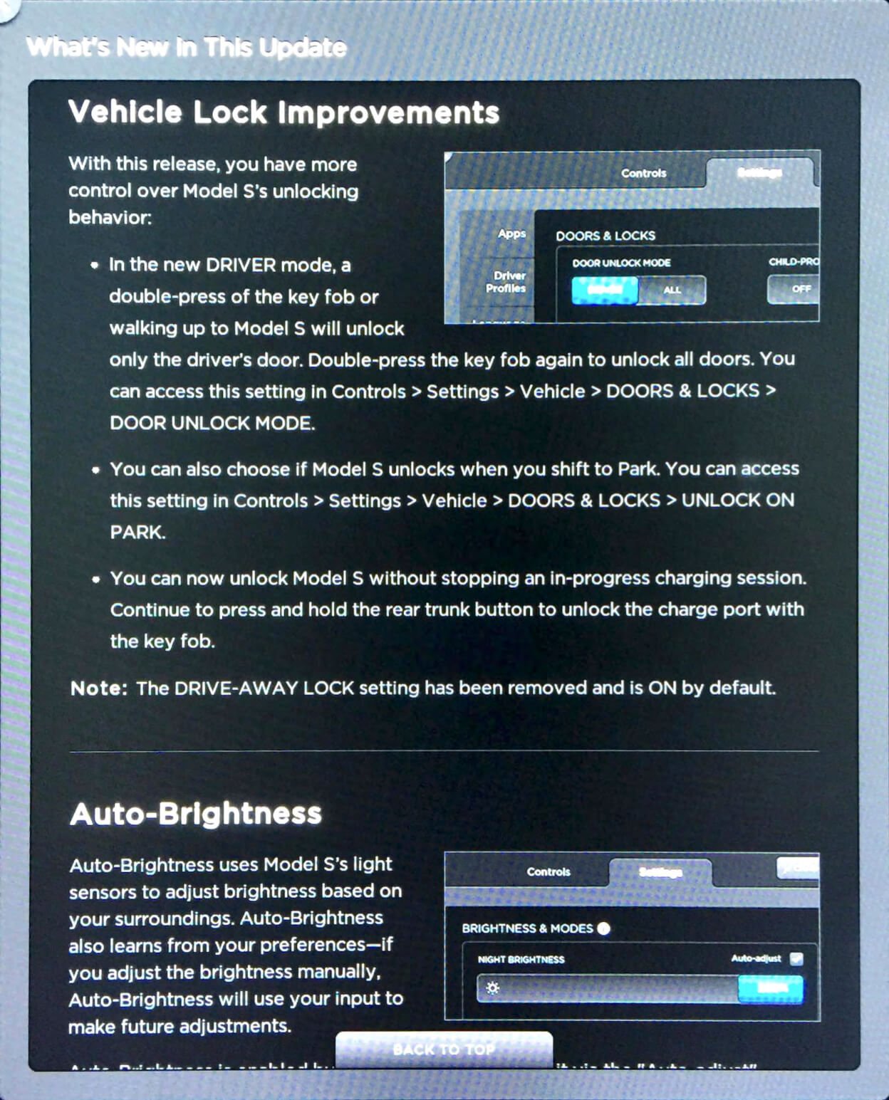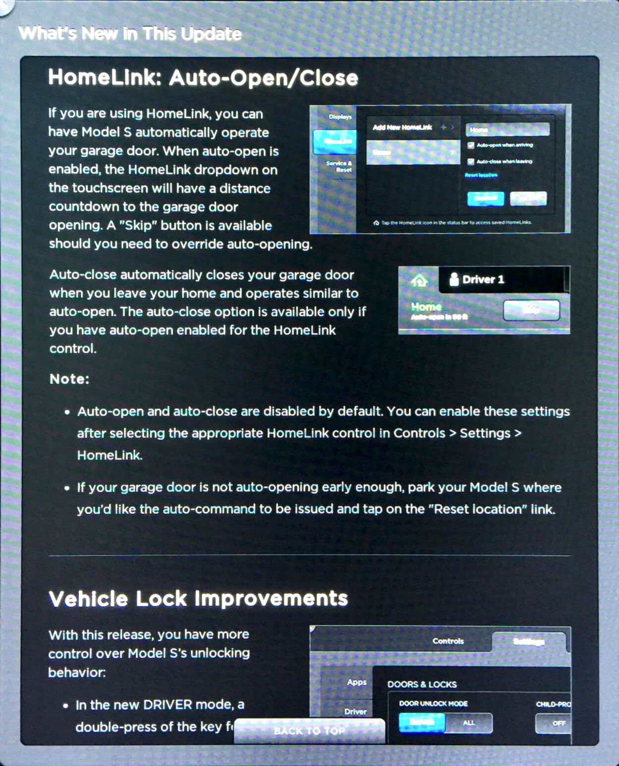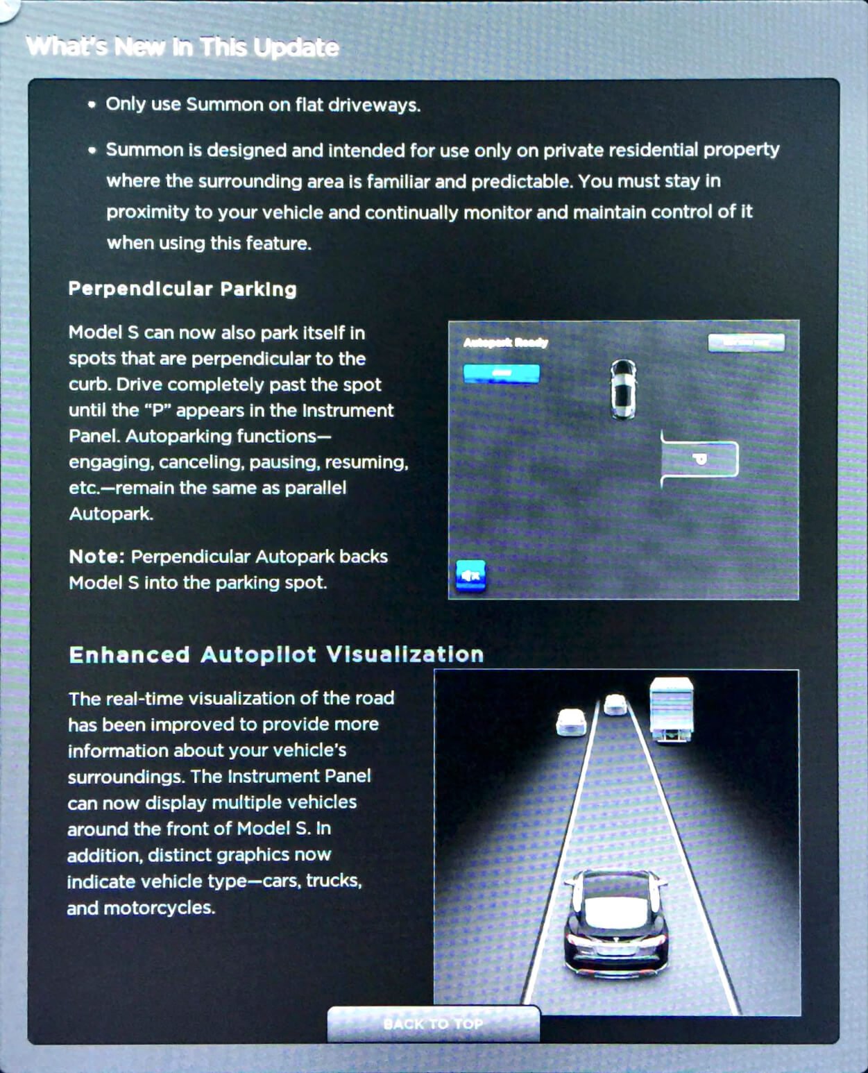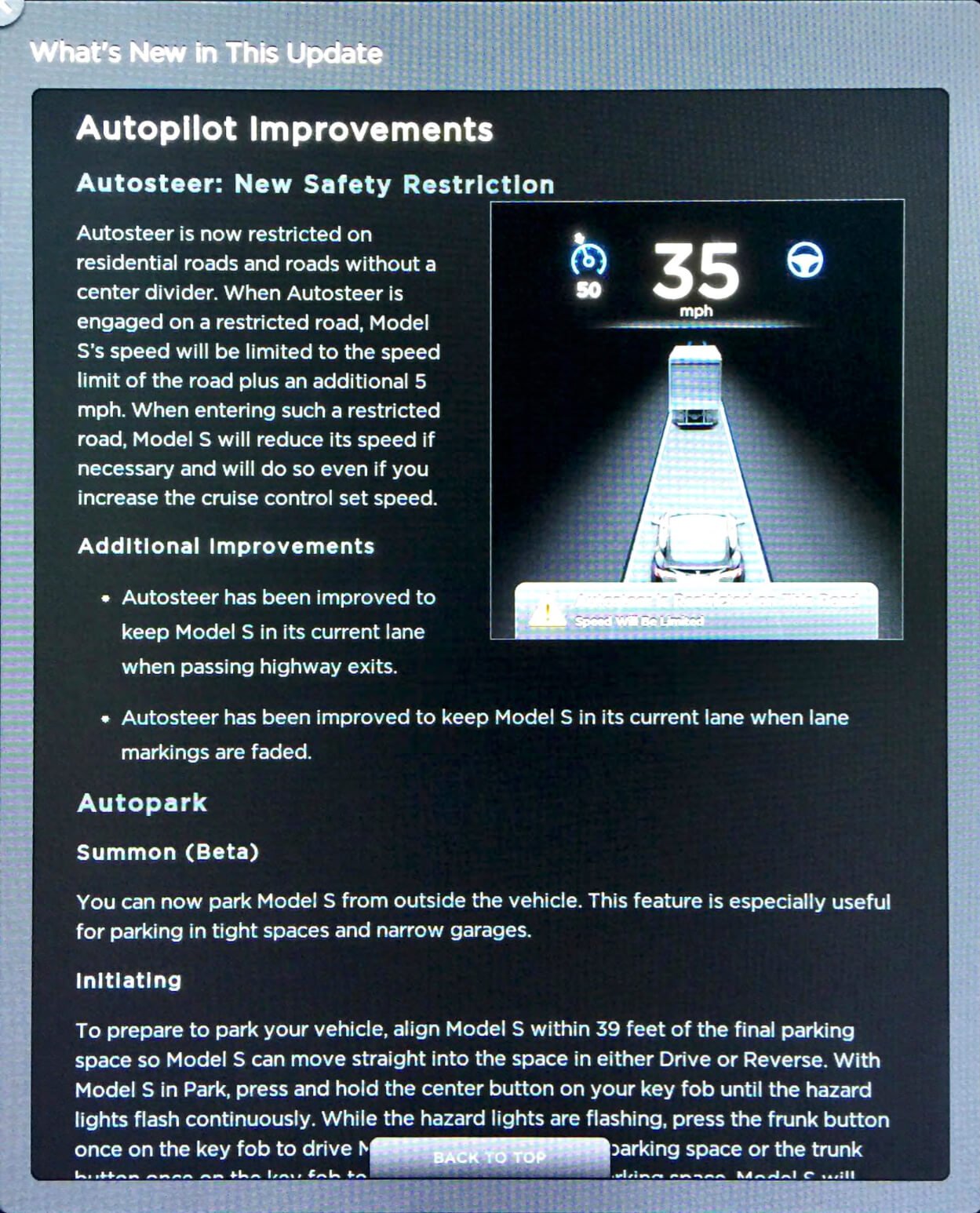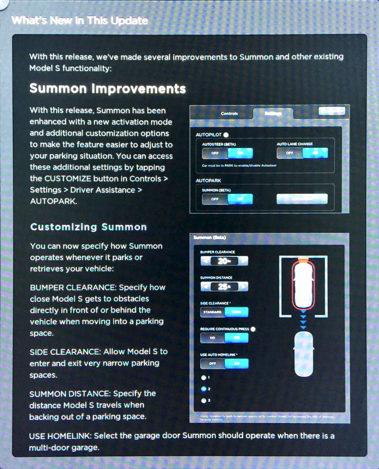 Es sind jedoch auch weitere, eher kleinere Verbesserungen hinzugekommen. Wirkliche Neuerungen werden jedoch erst einmal nur Kunden aus den Vereinigten Staaten feststellen. Dort wurde der „Summon“- und „Autopark“-Modus ein wenig erweitert. Wie ein Nutzer aus dem TMC-Forum schreibt, kann man das Model S oder X beim Herbeirufen (Summon) genauer konfigurieren. So ist es beispielsweise möglich den minimalen Abstand zwischen zwei Objekten vor oder hinter dem Fahrzeug zu definieren, wenn dieses selbstständig einparkt. Zudem kann man bestimmen, ob das eigene Fahrzeug sehr enge Parklücken nutzen soll oder nicht. Auch die Geschwindigkeit, mit der das Fahrzeug automatisch ausparkt, kann bestimmt werden. Verfügt man über mehrere Garagen, so kann man eindeutig definieren, welches Garagentor vom Fahrzeug selbst geöffnet und geschlossen werden kann, damit dieses sich anschließend selbstständig in die entsprechende Garage einparkt.