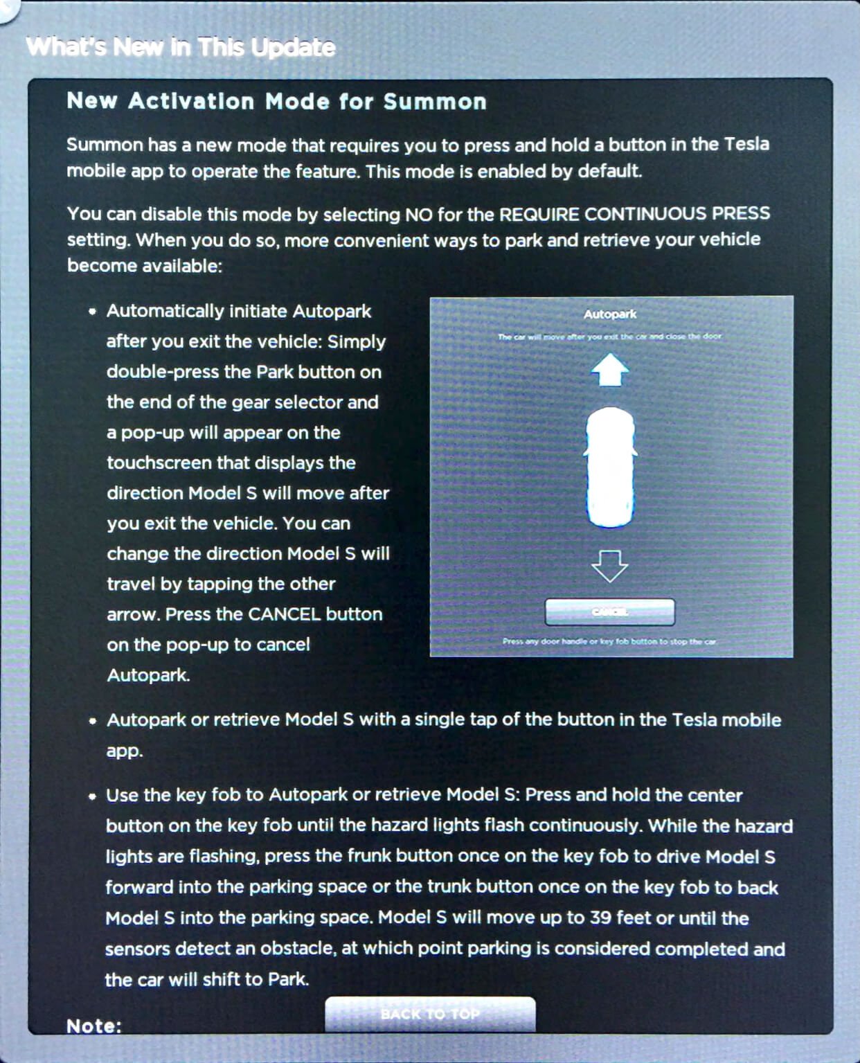 Wir hatten bereits vor knapp einer Woche darüber berichtet, dass Tesla Motors nach einem Sicherheitshinweis von Consumer Reports eine Restriktion für den „Summon“-Modus einführen wird. Genau das ist mit diesem Update auch schon geschehen. Wer sein Fahrzeug nun herbeirufen will, der muss den entsprechenden Knopf am Smartphone gedrückt halten. Es reicht nicht mehr, diesen lediglich einmal zu berühren. Laut Tesla Motors ist diese Funktion standardmäßig aktiviert, doch kann sie in den Einstellungen wieder deaktiviert werden.