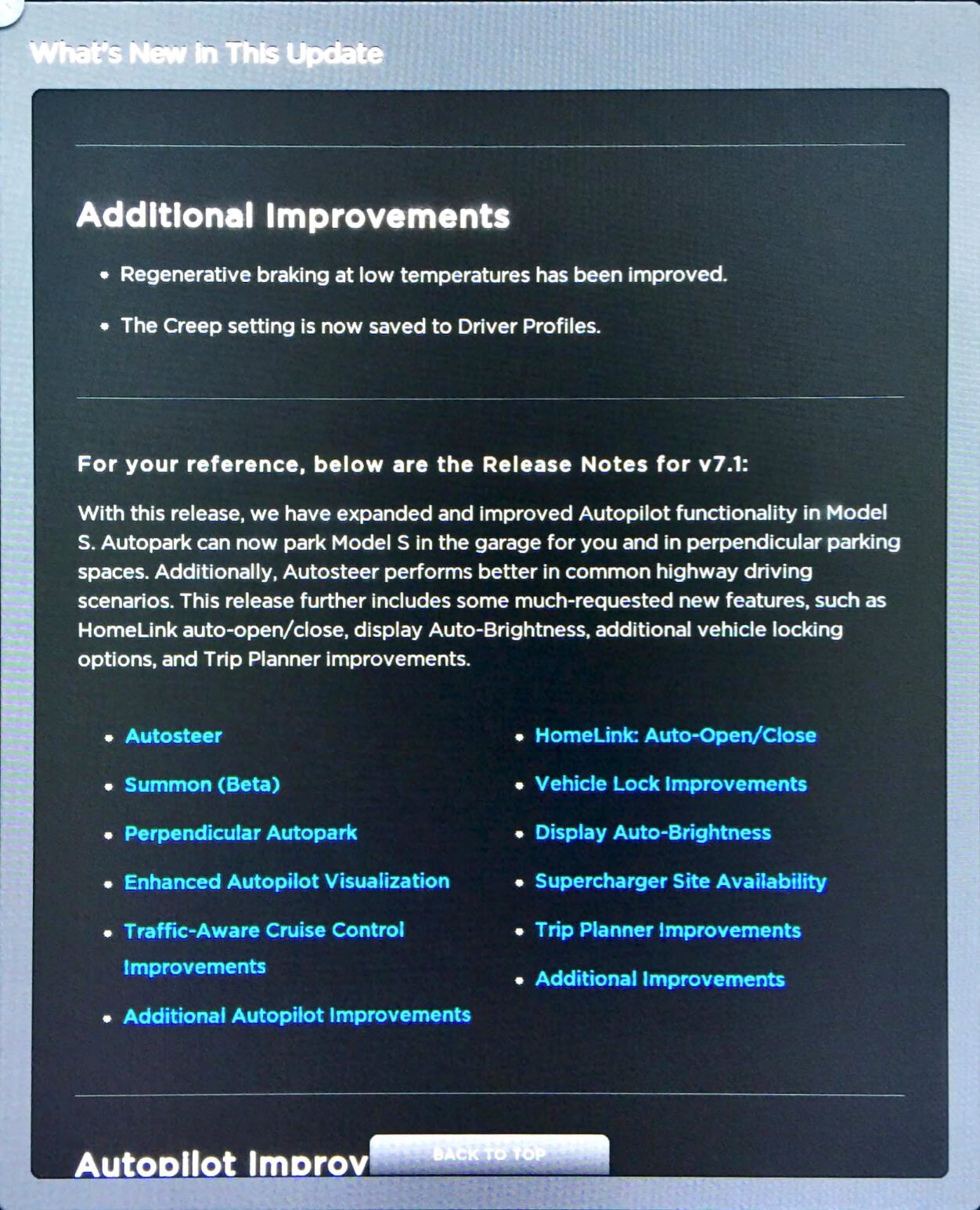 Tesla Motors hat gestern die Firmware v7.1 auf v7.1.2.12.22 aktualisiert. Deutsche Nutzer werden hierbei womöglich keine wesentlichen Veränderungen erfahren. So schreibt der Nutzer „siggy“ vom TFF-Forum, dass er lediglich folgende Veränderungen feststellte: