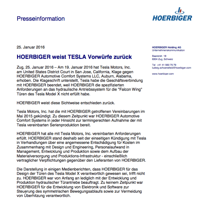 Update (22.01.16): Wie aus der Klageschrift zu entnehmen und in den Kommentaren hingewiesen, klagt Tesla Motors gegen die Tochtergesellschaft aus den USA und die Schweizer Holding (Hoerbiger Automotive Comfort Systems, LLC and Hoerbiger America Holding, Inc.). Es handelt sich dabei – trotz etlichen Medienberichten – nicht um ein deutsches Unternehmen.
