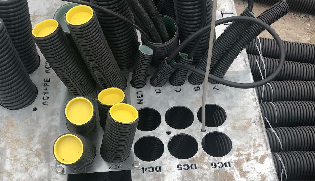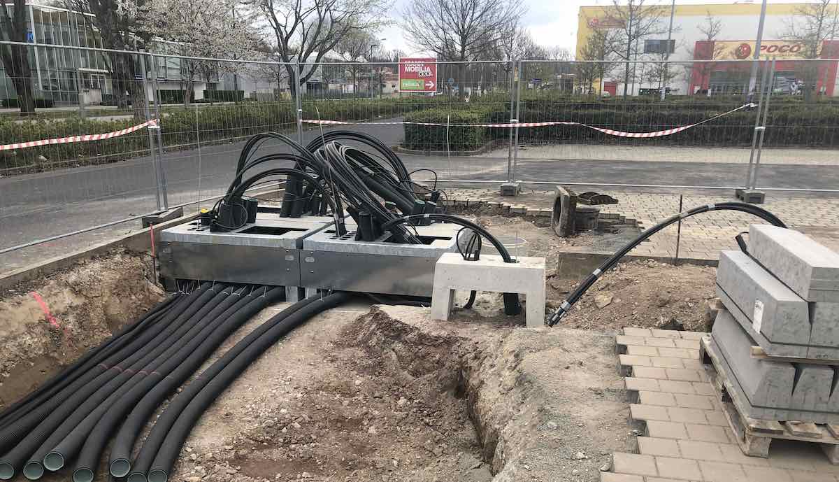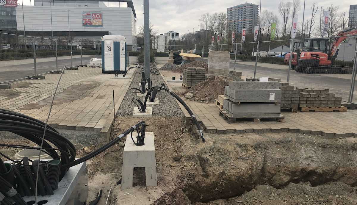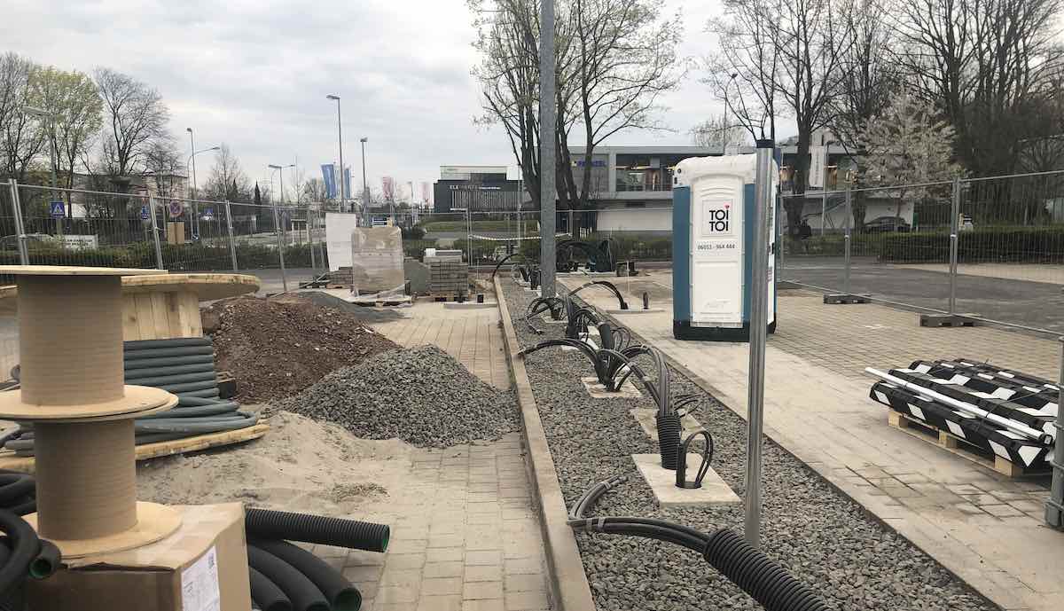 Ein Nutzer im TFF veröffentlichte umfangreiche aktuelle Fotos vom Bau des Standorts bei Frankfurt, der schon weit fortgeschritten scheint. Die von einem Bauzaun abgesperrte Fläche zwischen den Autobahnen A5 und A66 ist bereits weitestgehend gepflastert, überall ragen dicke Kabel und Leerrohre aus dem Boden. Tesla-Schilder sind auf den ersten Blick nicht zu sehen, aber Nutzer sowohl im TFF als auch bei supercharge.info waren sich sicher, dass hier für Tesla gearbeitet wird, und zwar an einem reinen V3-Standort.