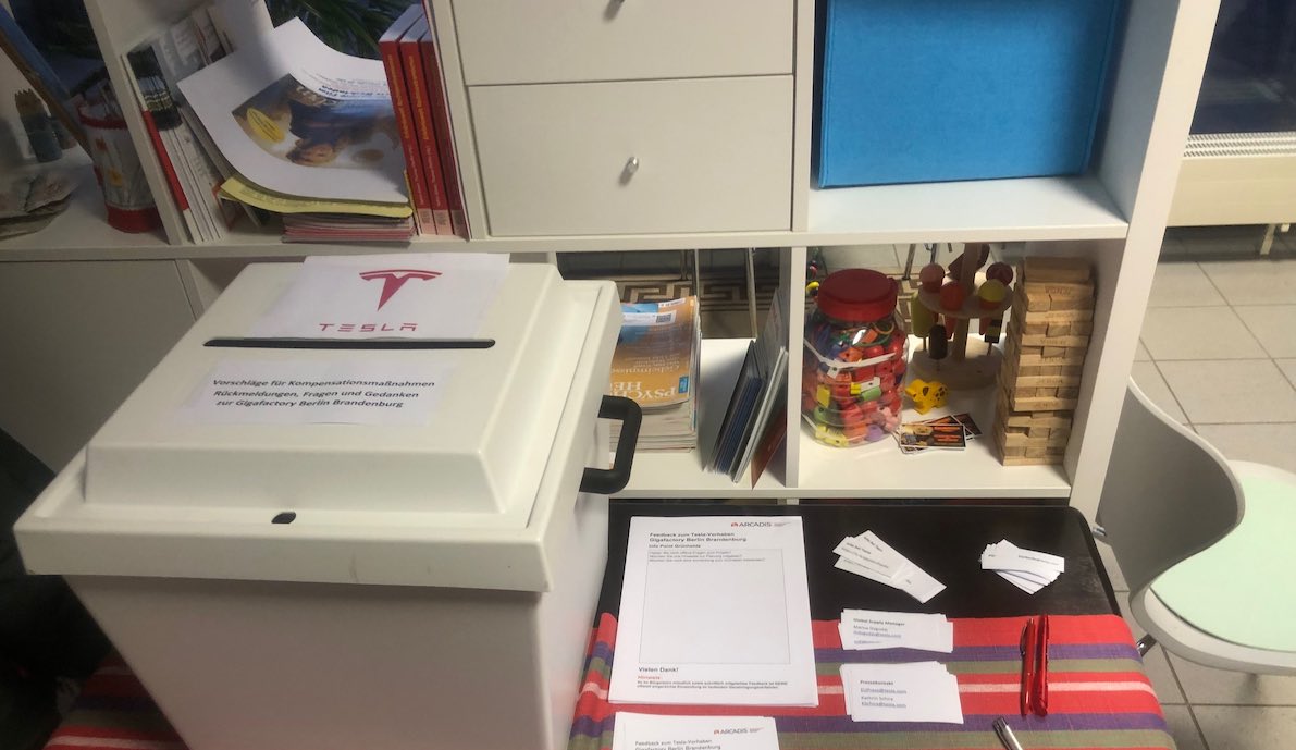 Wenig später stieß noch ein Jungpolitiker der lokalen SPD dazu, der nach Auskunft von de Bailly bei fast jeder der Tesla-Sprechstunden dabei war. Er wolle in der Bevölkerung die Stimmung einfangen, bestätigte er. Für Besucher liegen in dem Büro drei Visitenkarten bereit: eine für Presseanfragen, eine für Bewerbungen und eine für Unternehmen, die als Dienstleister Kontakt zu Tesla aufnehmen wollen. Daneben steht eine weiße Kiste mit Tesla-Logo und Briefschlitz zum Einwerfen von Vorschlägen sowie „Fragen, Rückmeldungen und Gedanken“ zur Gigafactory.