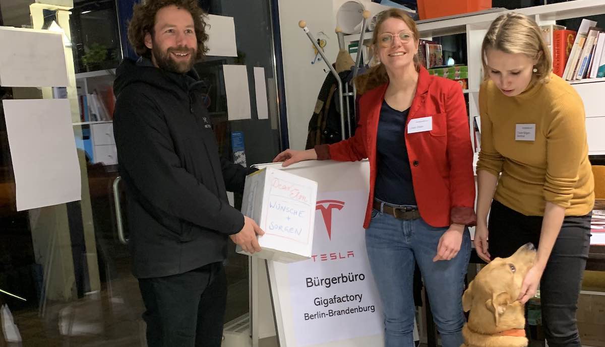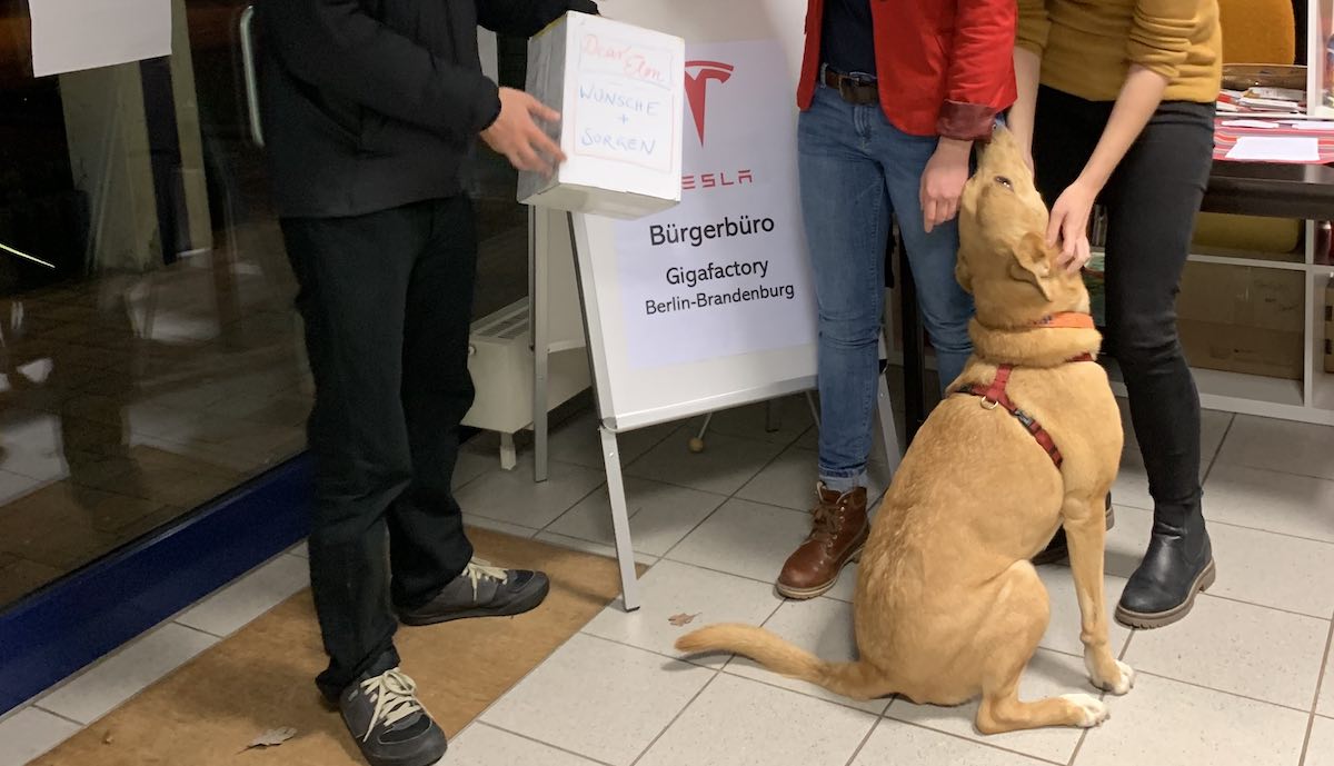 Um Fragen von Anwohnern zur geplanten Gigafactory in Grünheide (Giga Berlin) zu beantworten, veranstaltete Tesla in dem brandenburgischen Ort ab Mitte Januar zweimal wöchentlich Bürger-Sprechstunden. Eigentlich sollten diese Termine Ende Februar aufhören, doch wie die örtliche Tesla-Gastgeberin jetzt auf Anfrage mitteilte, hat das Unternehmen beschlossen, das Angebot zunächst bis Ende März zu verlängern. Und sie lieferte Bilder von dem Hund nach, den teslamag.de in einem Bericht über einen Besuch Ende Februar erwähnt hatte und den daraufhin viele Leser sehen wollten.