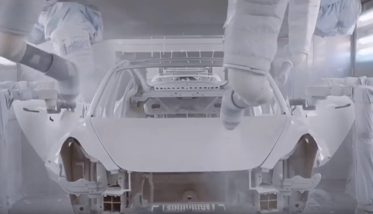 Nächster Schritt im Video ist schon die Lackierstraße. Mehrere sorgfältig verpackte Maschinen-Arme bewegen sich rasch um das entstehende Tesla-Elektroauto herum, um das Blech von allen Seiten und an allen Stellen mit Farbe zu versehen; einer davon klappt zunächst die schon montierte Frunk-Haube auf. Das gefilmte Model 3 scheint ein weißes zu werden.