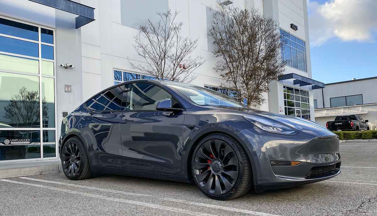 Während das Model Y von Signature Customs mit seiner auffälligen Folie und Bodennähe heraussticht, blieb Unplugged Performance (UP) vorerst zurückhaltender. „Wir haben die ultimativen Tieferlegungsfedern für das Tesla Model Y entwickelt“, kündigte das Unternehmen im Tesla Motors Club an. Als erstes werde die Stufe „moderat“ angeboten, mit Handling wie in einem Sportwagen, Tieferlegung und (vermutlich dadurch) höherer Reichweite. Tatsächlich sieht das graue Performance-Modell von UP trotz der gleichen dunklen Felgen weitaus ziviler aus die radikal tiefe Variante der Konkurrenz.