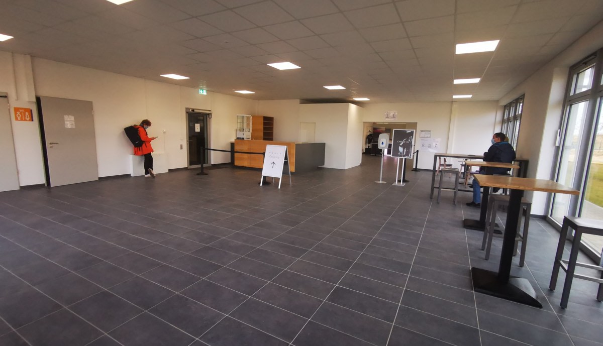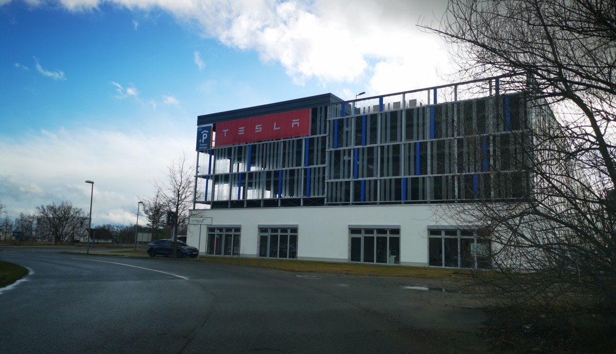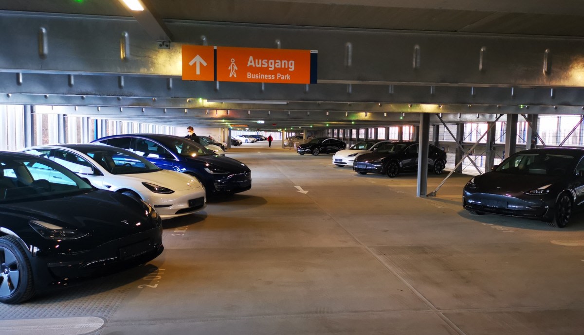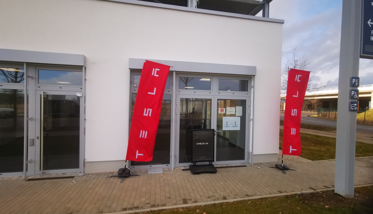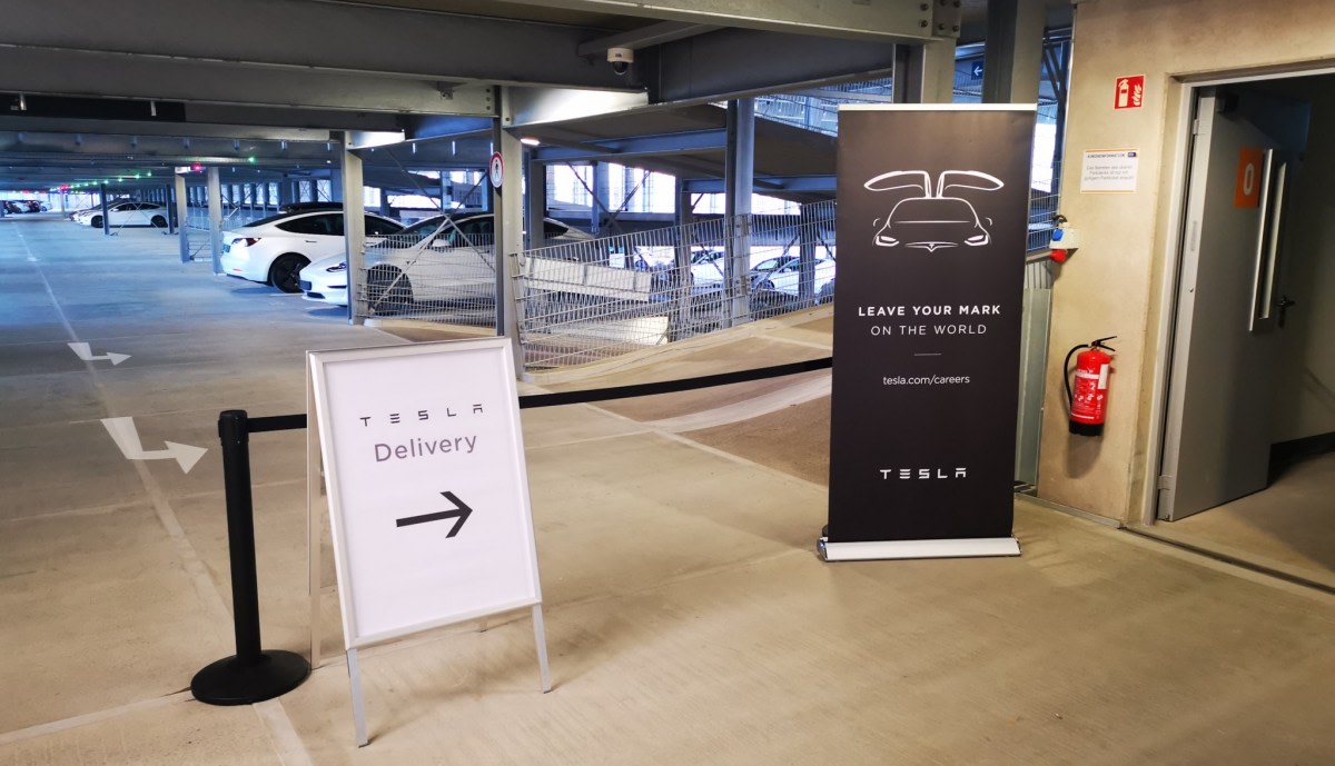 Geleitet vom Navi im alten Tesla, waren wir kurz vor dem Termin dort. Für Nicht-Tauscher hält eine Buslinie direkt vor dem Auslieferzentrum, einem Parkhaus in direkter Nähe zum neuen Berliner Flughafen – anfliegende Maschinen überqueren es unmittelbar. Innen ist alles gut ausgeschildert. Beim Betreten des Centers fiel uns auf, dass offenbar für reguläre Zeiten außerhalb der Corona-Pandemie eine kleine Cafebar verfügbar ist. Die Preisschilder, drei Euro für einen RedBull, standen noch, ausgeschenkt wurde aber aufgrund der aktuellen Hygienevorschriften nichts. Im vorderen von zwei Räumen befinden sich einige Tische samt Stühlen als Wartebereich, im hinteren Bereich stehen zwei Tresen, links für Trade-Ins, rechts für Auslieferung. Außer uns waren noch insgesamt vier Personen vor Ort.