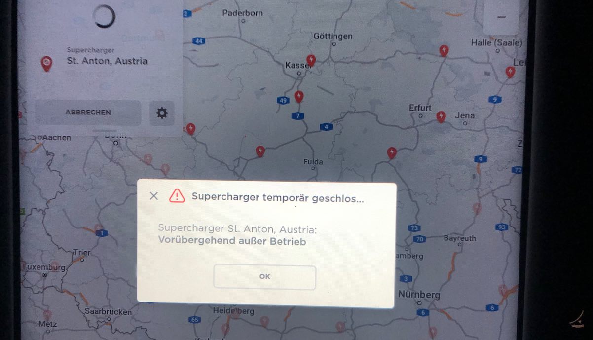 Mit einem Tipper auf den großen Bildschirm in Elektroautos von Tesla lässt die Kartenansicht so umstellen, dass darauf auch Lademöglichkeiten angezeigt werden – was auch im großen Maßstab funktioniert. Die Supercharger-Standorte werden mit kleinen roten Blasen mit Stromblitz darin angezeigt. Und in Österreichs Westen fällt auf, dass viele dieser Symbole derzeit nur blassrosa und mit einem Sperr-Symbol erscheinen. Wenn man auf eines davon tippt, erscheint die Meldung „vorübergehend außer Betrieb“. Wer versucht, einen der betroffenen Supercharger als Reiseziel einzugeben, wird ebenfalls auf eine „temporäre“ Schließung hingewiesen. Auf der Supercharger-Karte von Tesla im Web dagegen werden alle Standorte regulär gezeigt.