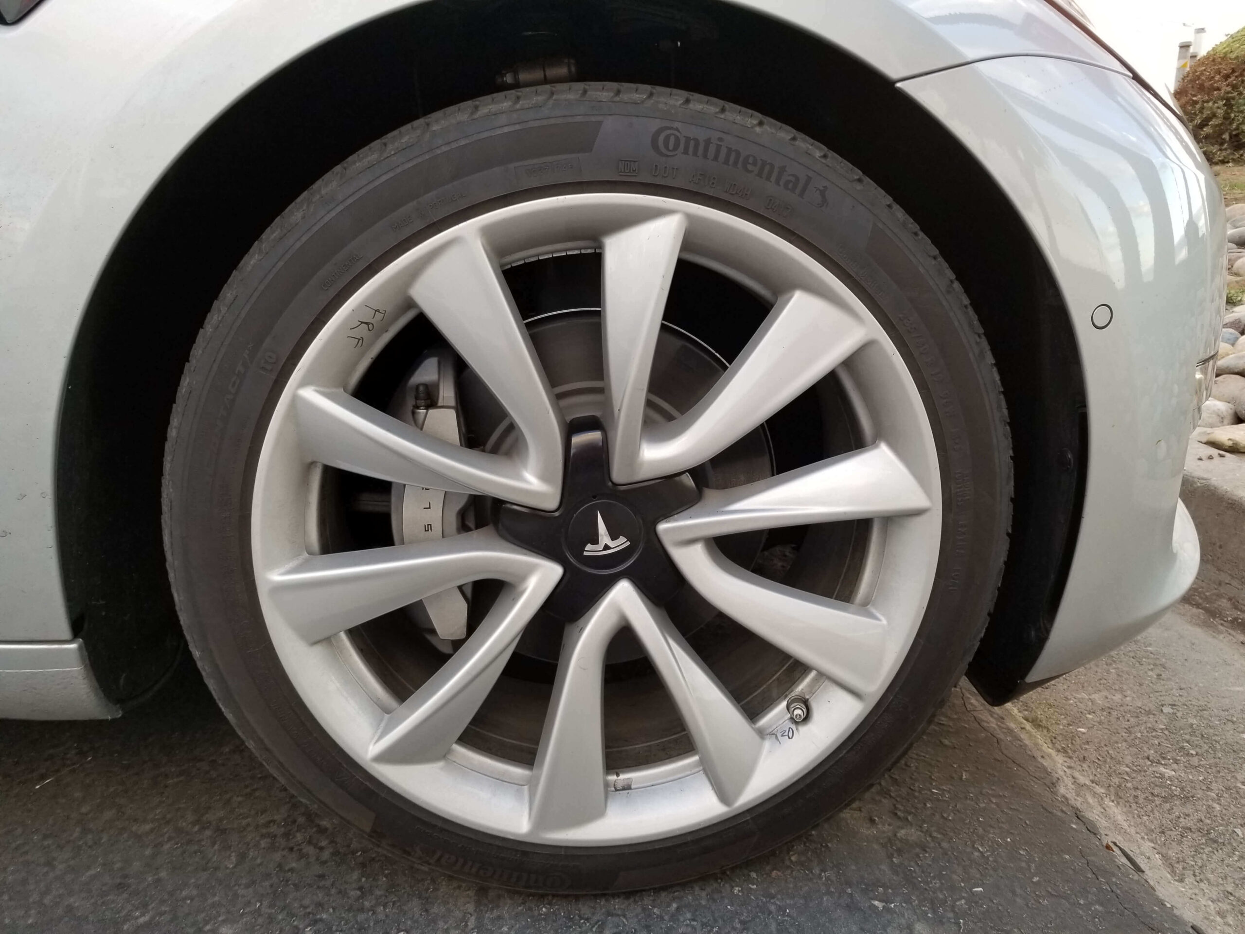 Das abgelichtete Model 3 besitzt die 19 Zoll Felgen, welches erstmals mit einer schwarzen Tesla-Nabenkappe ausgerüstet waren. Zuvor waren alle Felgen gesichteter Testfahrzeuge ohne Nabenkappen ausgestattet.